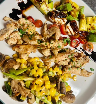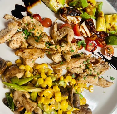 Pollo,aguacate,champiñón,cherrys,esparragos, bocconcini y maíz.